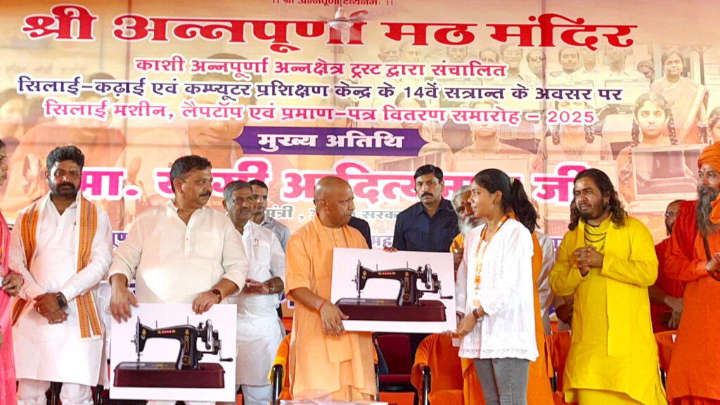 वाराणसी। उत्तर प्रदेश के मुख्यमंत्री योगी आदित्यनाथ ने अपने दो दिवसीय दौरे के पहले दिन सोमवार को शिवपुर स्थित अन्नपुर्णा ऋषिकुल ब्रह्मचर्याश्रम संस्कृत महाविद्यालय में आयोजित काशी अन्नपूर्णा अन्न क्षेत्र ट्रस्ट द्वारा संचालित सिलाई-कढ़ाई एवं कंप्यूटर प्रशिक्षण केंद्र के 14वें सत्रांत के अवसर पर लगभग 250 बालक-बालिकाओं को सिलाई मशीन लैपटॉप एवं प्रमाण पत्र का वितरण किया।