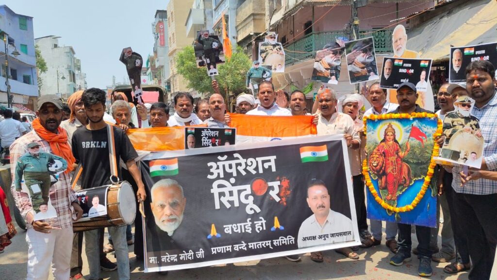 गीता मंदिर के पास एक भावपूर्ण राष्ट्रभक्ति कार्यक्रम आयोजित किया गया। जहाँ हाथों में तिरंगा लेकर “भारत माता की जय”, “जय जवान”, और “जय हिंद” जैसे गगनभेदी नारों व ढोल नगाड़े, पटाखे के साथ सिंदूर का तिलक लगाकर एक दूसरे का मुंह मीठा कराया गया और देशभक्ति का संदेश दिया। कार्यक्रम का नेतृत्व संस्था के अध्यक्ष अनूप जायसवाल ने किया ।