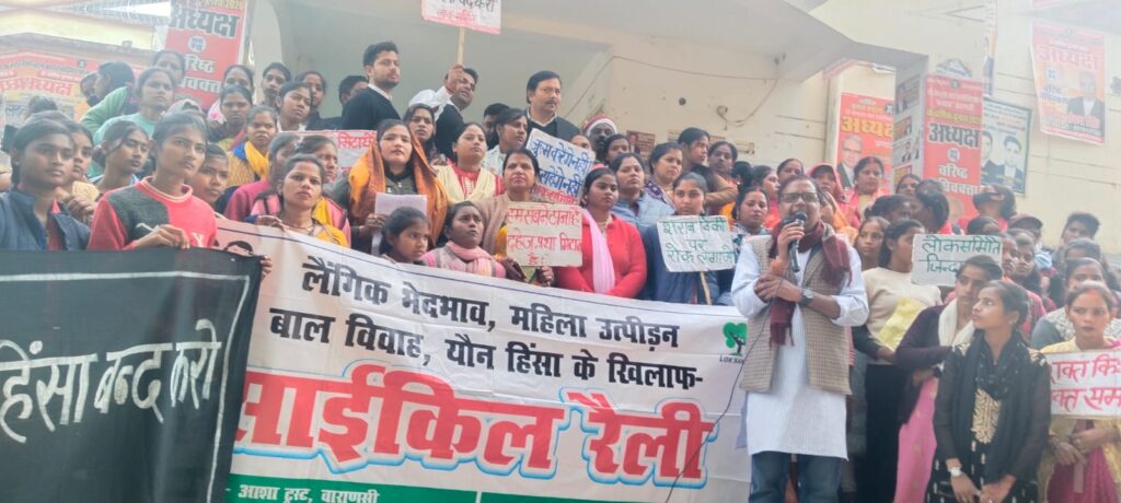वाराणसी, जनमुख न्यूज़। निर्भया दिवस के अवसर पर मंगलवार को प्रधानमंत्री के सांसद आदर्श नागेपुर से सैकड़ों महिलाओं और बालिकाओं ने घरेलु महिला हिंसा, लैंगिक भेदभाव, यौन उत्पीड़न व शराब बिक्री के खिलाफ साइकिल रैली निकाली. आशा ट्रस्ट व लोक समिति द्वारा आयोजित जन आक्रोश साइकिल रैली में आराजीलाइन और सेवापुरी ब्लाक के दर्जनों गांव से आई सैकड़ों महिलाएं और बालिकाएं नागेपुर स्थित लोक समिति आश्रम पर जुटी। जिसमे नागेपुर से प्रारम्भ हुई साइकिल रैली मेंहदीगंज, बीरभानपुर, कचनार, राजातालाब बाजार और आराजीलाइन ब्लाक मुख्यालय होते हुए राजातालाब तहसील पर पहुंची। हाथ में तख्ती-बैनर लिए लोगों ने तहसील गेट पर बालिकाओं और महिलाओं की शिक्षा और सुरक्षा को लेकर जोरदार प्रदर्शन किया। लोगों ने महिला हिंसा बंद करो, छेड़खानी पर रोक लगाओ, शराब बेचना बंद करो, चुप नही रहना हैं हिंसा नहीं सहना हैं, भेदभाव मिटायेंगे नया समाज बनाएंगे आदि नारे लगाए।