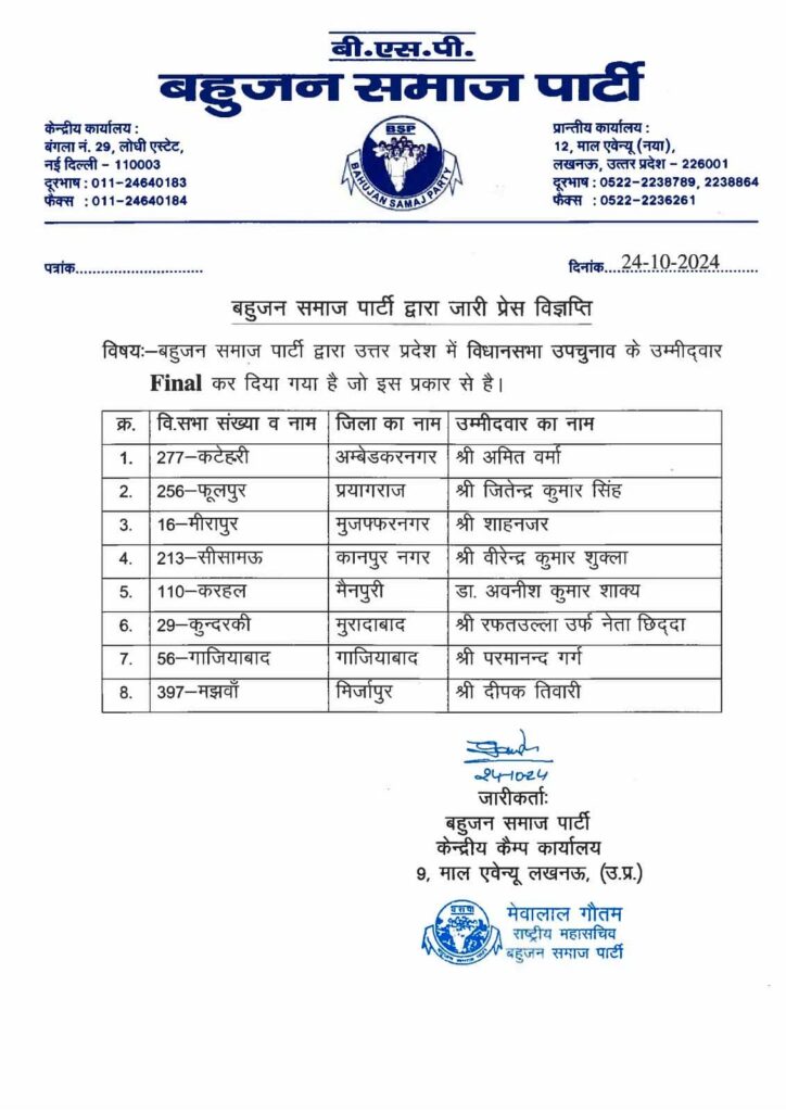 बसपा ने अंबेडकरनगर की कटेहरी सीट से अमित वर्मा, प्रयागराज की फूलपुर सीट से जितेंद्र कुमार सिंह को, मुजफ्फरनगर के मीरापुर से शाहनजर को, कानपुर नगर की सीसामऊ सीट से वीरेंद्र कुमार शुक्ला को प्रत्याशी बनाया है।
