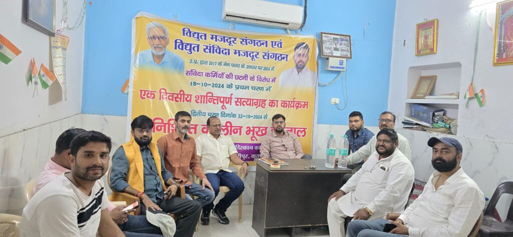 बैठक में पदाधिकारियों ने कहा कि पूर्वांचल विद्युत वितरण निगम में व्याप्त अनियमितता और मनमाना पूर्ण तरीके से करवाई का सिलसिला जारी है। 16,17 एवं 18 मार्च 2023 को हुई हड़ताल में शामिल न होने और काम पर मौजूद रहने के बावजूद 128 संविदा कर्मियों को कार्य से हटा दिया गया एवं अन्य समस्याएं भी काफी लंबे समय से लंबित चल रही है जो अन्यायपूर्ण है। उत्तर प्रदेश पावर कारपोरेशन के अध्यक्ष और ऊर्जा मंत्री ने निर्दोष कर्मचारियों को पुनः कार्य पर लेने का आश्वासन दिया था। लेकिन इस पर अमल नहीं हुआ। इस अन्याय के खिलाफ, विद्युत संविदा मजदूर संगठन उत्तर प्रदेश के प्रदेश प्रभारी पुनीत राय 17 मार्च 2025 से पूर्वांचल प्रबंध निदेशक कार्यालय, मडुआडीह, वाराणसी पर अनिश्चितकालीन भूख हड़ताल करेंगे