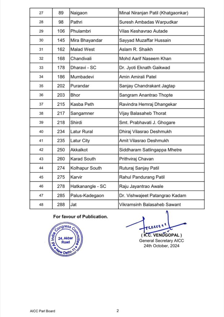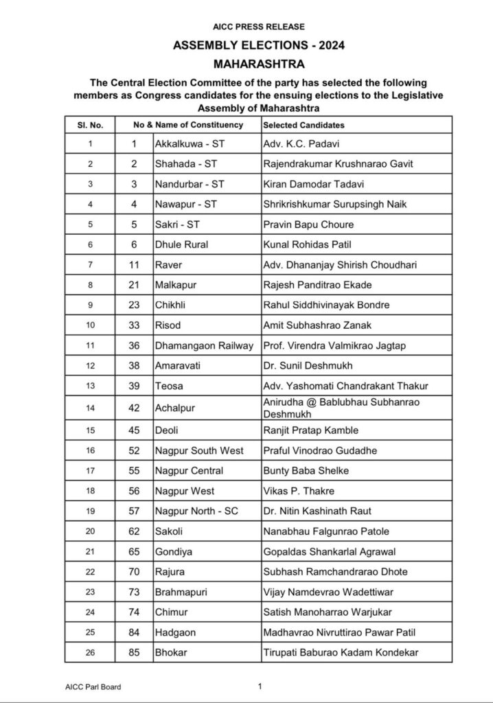 महाराष्ट्र विधानसभा चुनाव के लिए कांग्रेस प्रत्याशियों की पहली सूची जारी