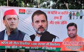 सपा का नया होर्डिंग- बंटोगे तो सिलेंडर 1200 में मिलेगा