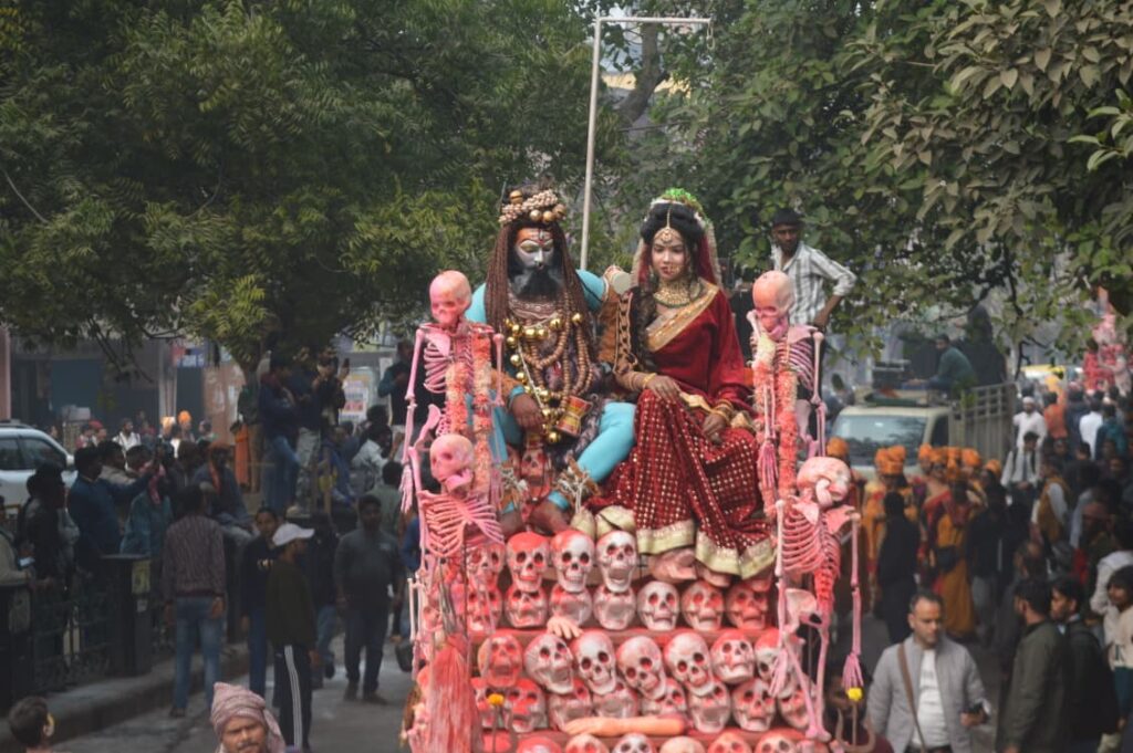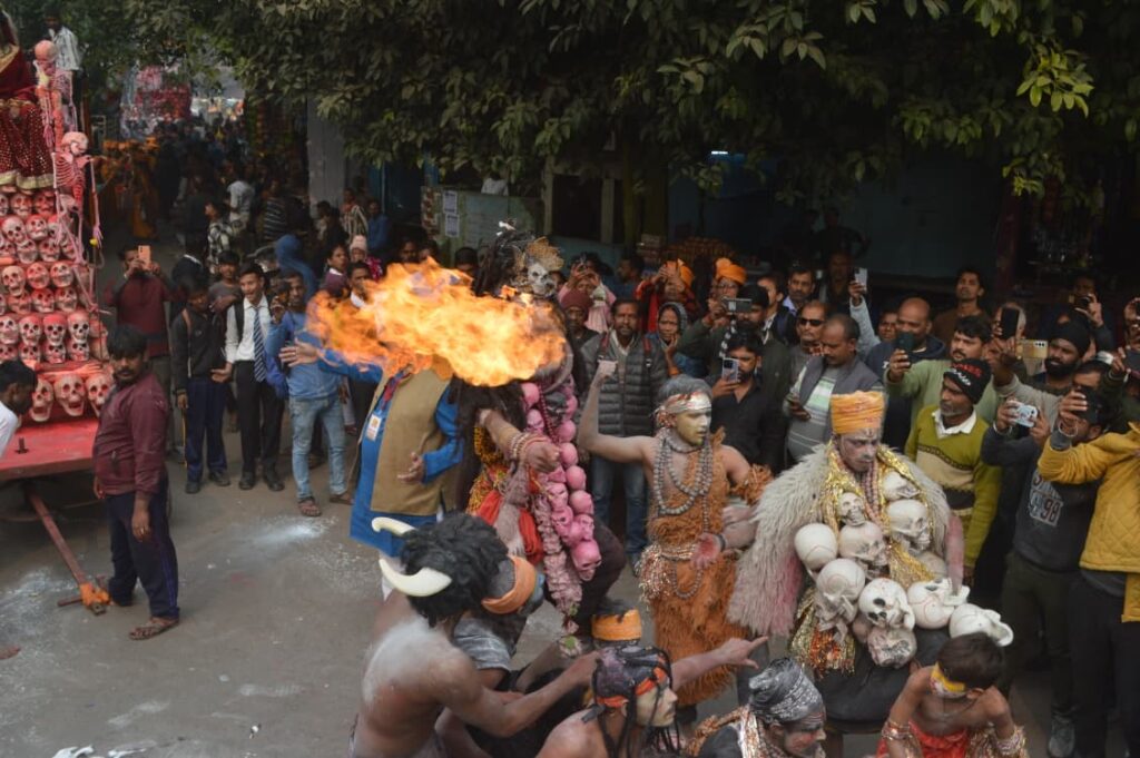 वाराणसी जनमुख न्यूज़। गले में नरमुंड माला, शरीर पर सांप, मुंह से उगलते आग के गोले और शिव तांडव का अद्भुत दृश्य शनिवार को वाराणसी में देखने को मिला। श्रीकाशी विश्वनाथ धाम के लोकार्पण के चार वर्ष पूरे होने के अवसर पर काशी में भव्य शोभायात्रा निकाली गई, जिसने श्रद्धालुओं और पर्यटकों को मंत्रमुग्ध कर दिया।