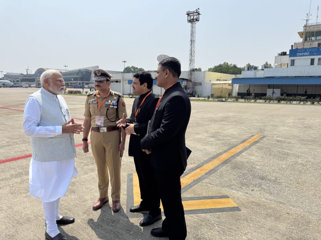 एयरपोर्ट पहुंचने पर प्रधानमंत्री का स्वागत मंडलायुक्त कौशल राज शर्मा, पुलिस कमिश्नर मोहित अग्रवाल, जिलाधिकारी एस राजलिंगम द्वारा किया गया। इस अवसर पर प्रधानमंत्री ने अधिकारियों से वाराणसी के विकास कार्यों समेत विभिन्न मुद्दों पर गहन चर्चा की गयी। एयरपोर्ट से प्रधानमंत्री हेलिकॉप्टर से सीधे सभा स्थल मेहंदी गंज को निकले।