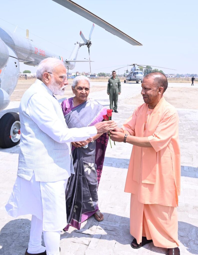 लाल बहादुर शास्त्री अंतर्राष्ट्रीय हवाई अड्डा से प्रधानमंत्री नरेंद्र मोदी के मेहंदीगंज पहुंचने पर पहुंचने पर उत्तर प्रदेश की राज्यपाल आनंदीबेन पटेल एवं मुख्यमंत्री योगी आदित्यनाथ ने स्वागत किया।