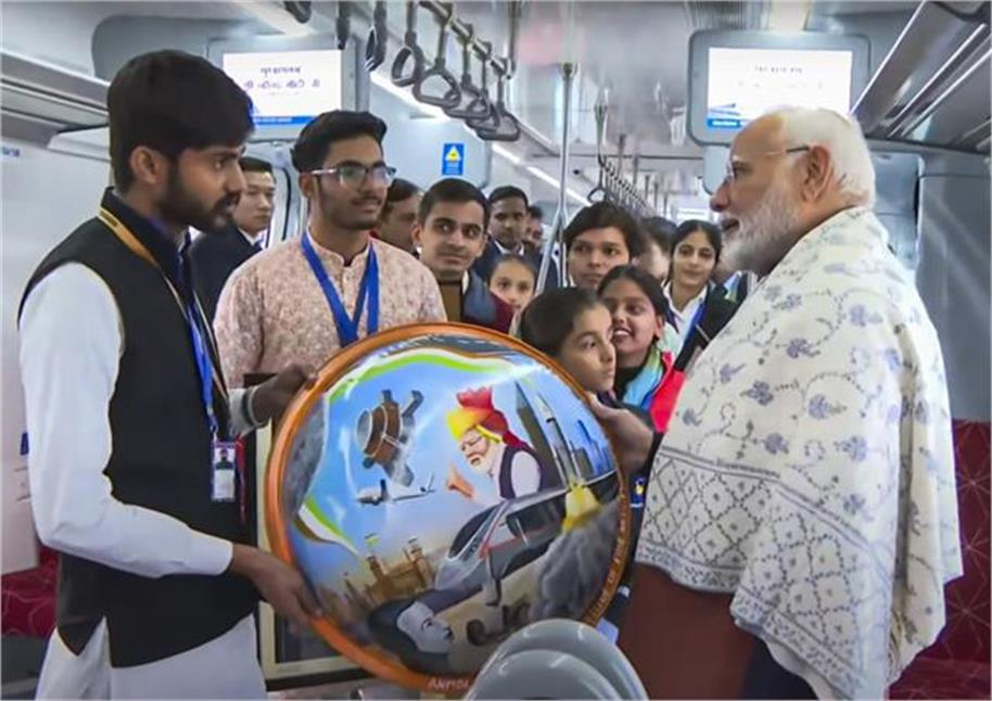 मेट्रों कॉरिडोर के उद्घाटन के बाद प्रधानमंत्री मोदी ने नमो भारत ट्रेन में यात्रा के दौरान स्मार्ट टिकट खरीदा और यात्रियों से बातचीत की। उन्होंने स्कूली बच्चों से बातचीत की जिन्होंने रेखाचित्र प्रस्तुत किए और कविताएं सुनाईं। एक छात्र ने ‘नव भारत’ शीर्षक से एक कविता सुनाई, जिसकी प्रधानमंत्री ने सराहना की।