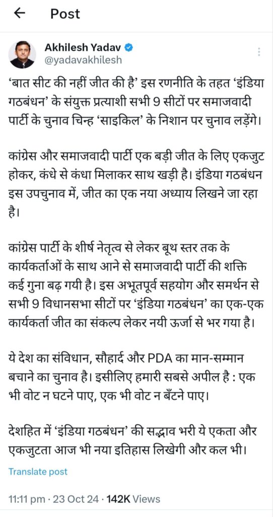 रात 11 बजे किए गए ट्वीट में अखिलेश यादव ने लिखा है कि ‘बात सीट की नहीं जीत की है’ इस रणनीति के तहत ‘इंडिया गठबंधन’ के संयुक्त प्रत्याशी सभी 9 सीटों पर समाजवादी पार्टी के चुनाव चिन्ह ‘साइकिल’ के निशान पर चुनाव लड़ेंगे।