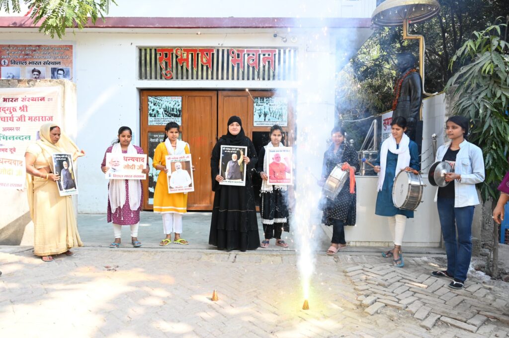 वाराणसी, जनमुख न्यूज। दिल्ली जीतने की खबर पर वाराणसी में नरेन्द्र मोदी के संसदीय क्षेत्र की महिलाओं ने अनार जलाकर और बैंड बाजा बजाकर खुशी मनाई। विशाल भारत संस्थान एवं मुस्लिम महिला फाउण्डेशन के संयुक्त तत्वाधान में लमही के सुभाष भवन में जीत का जश्न मनाया गया। प्रधानमंत्री नरेन्द्र मोदी को बधाई दी गयी। मोदी के पोस्टर के साथ मोदी जिन्दाबाद के नारे लगाए।